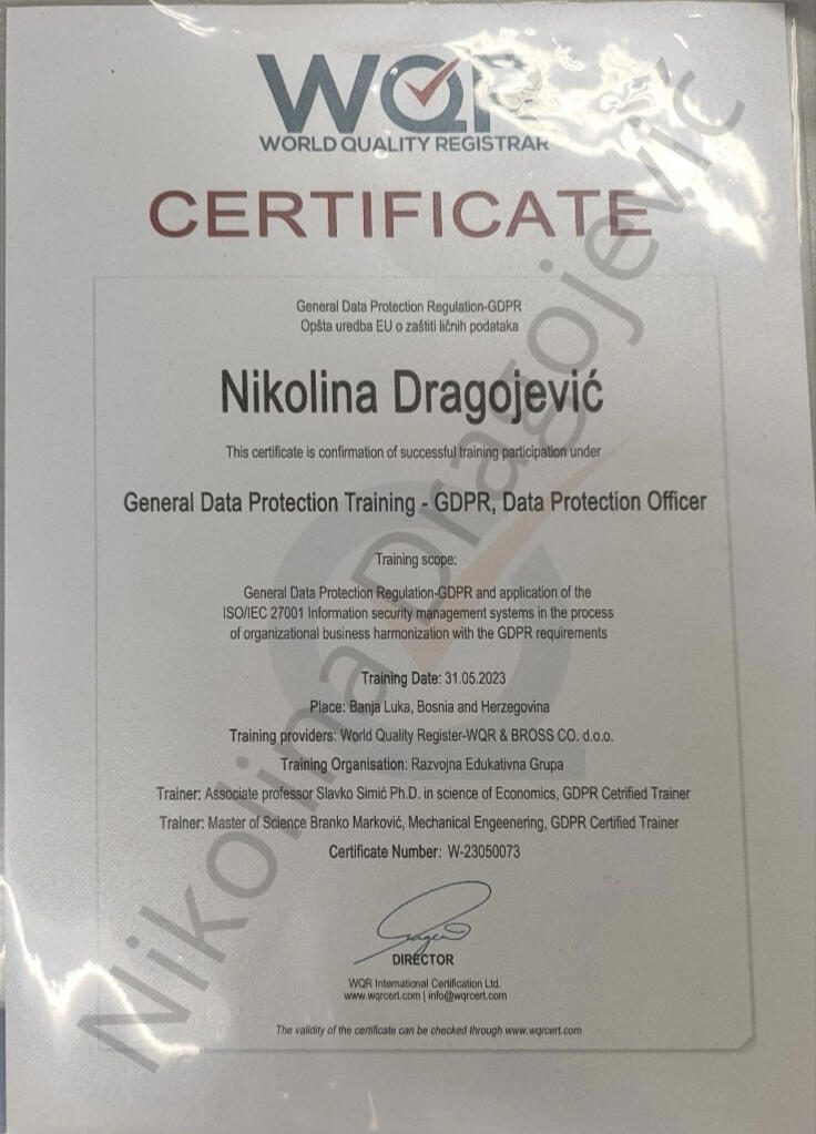Stručna podrška firmama u Bosni i Hercegovini u procesu usklađivanja sa GDPR-om i domaćim propisima. Priprema dokumentacije, analiza rizika i implementacija mjera zaštite podataka obezbjeđuju zakonito i bezbrižno poslovanje.